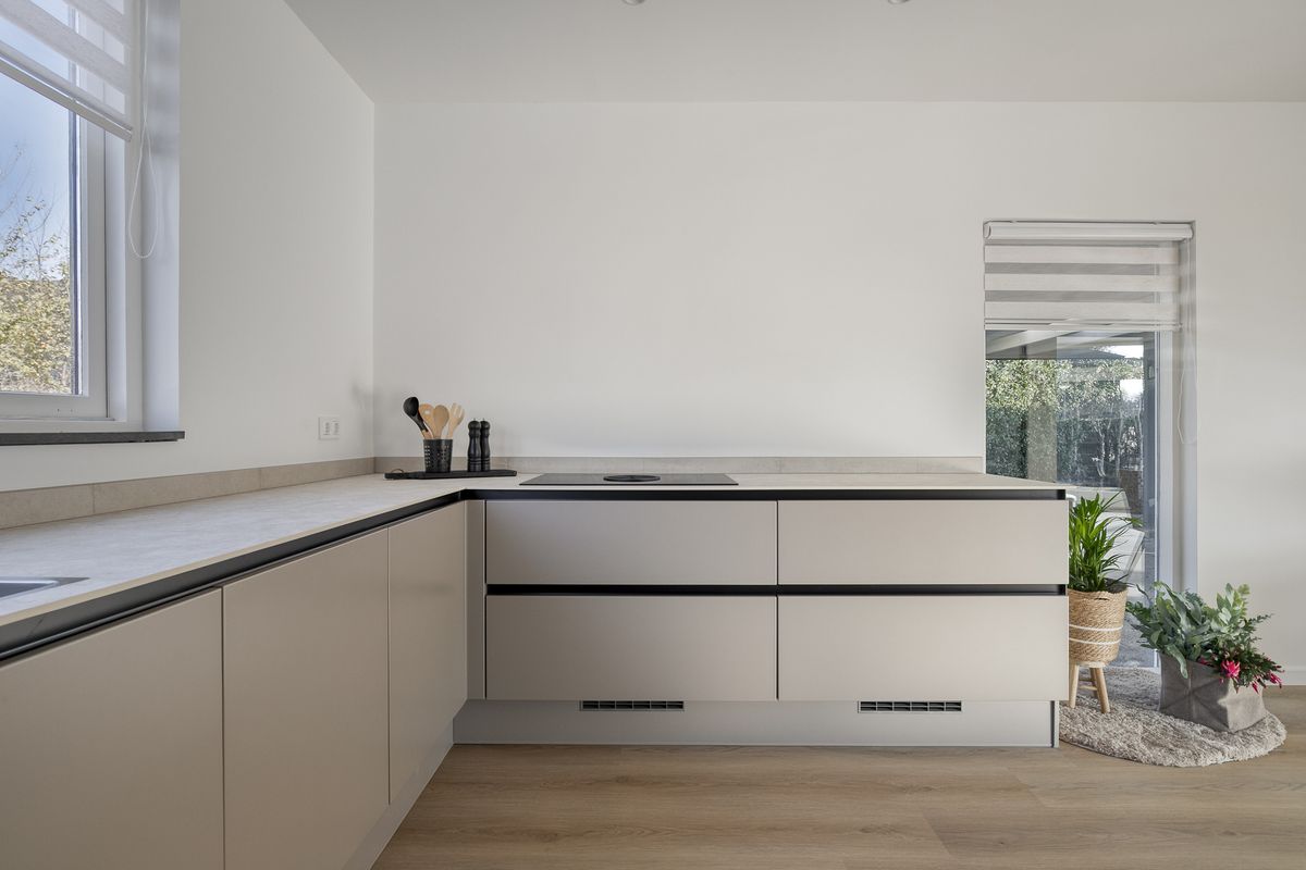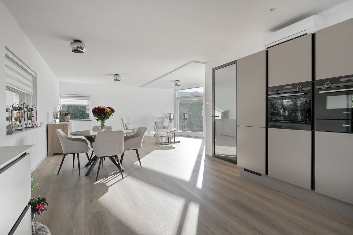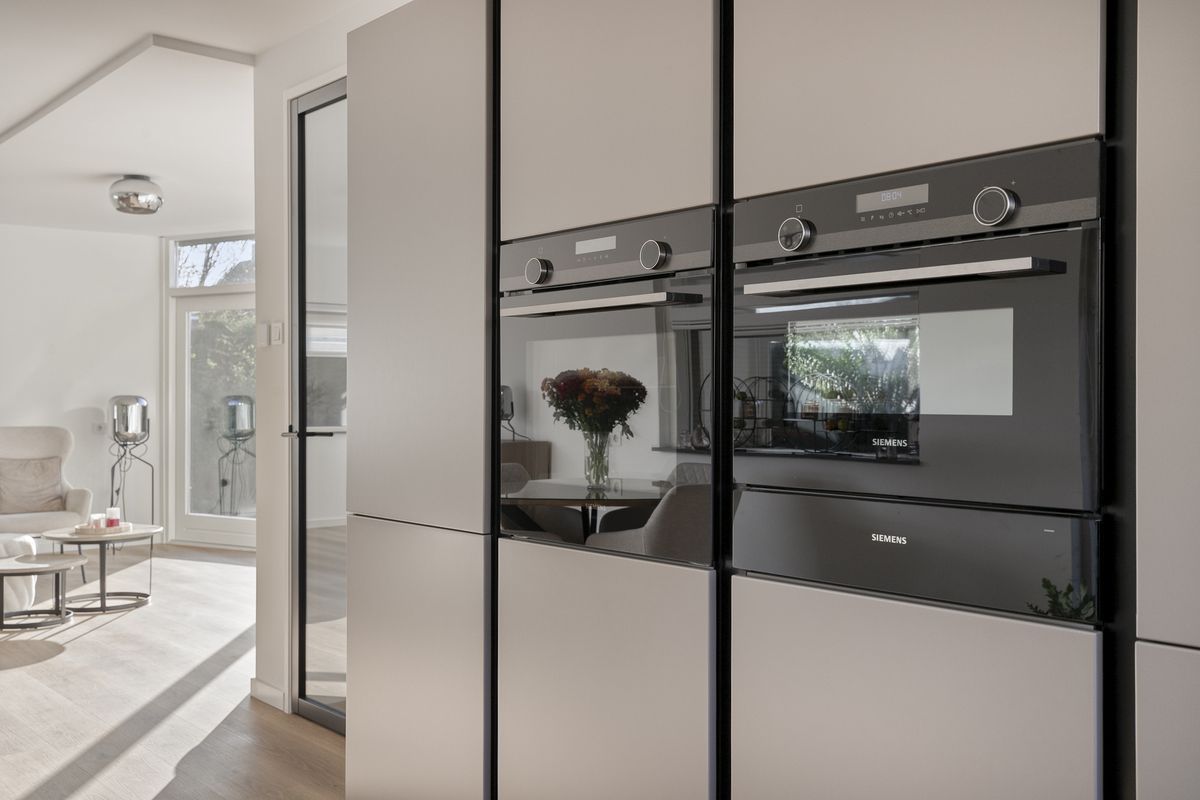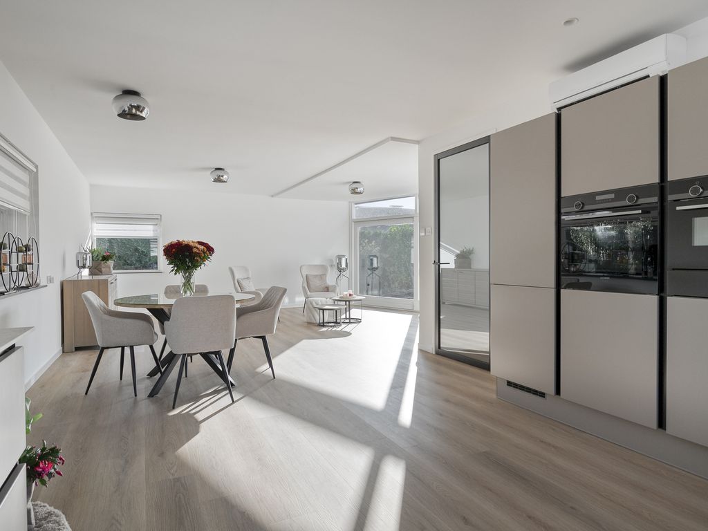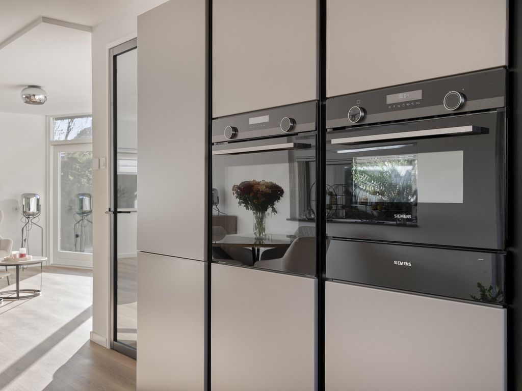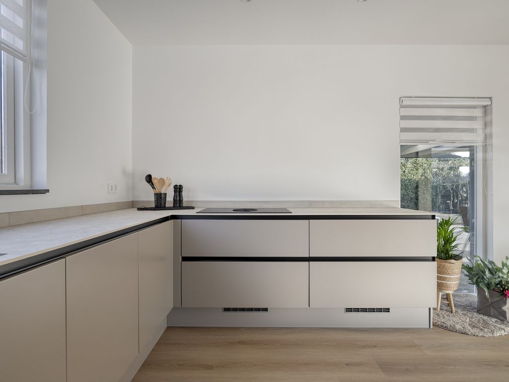 - De open keuken is gesitueerd in een U-vormige opstelling en voorzien van een koelkast, vriezer, Bora kookplaat met afzuiging, warmhoudlade, vaatwasser, combimagnetron, oven en airco.
