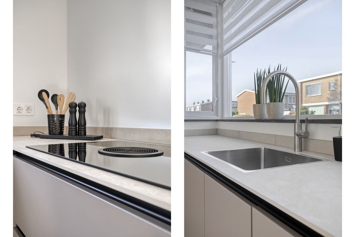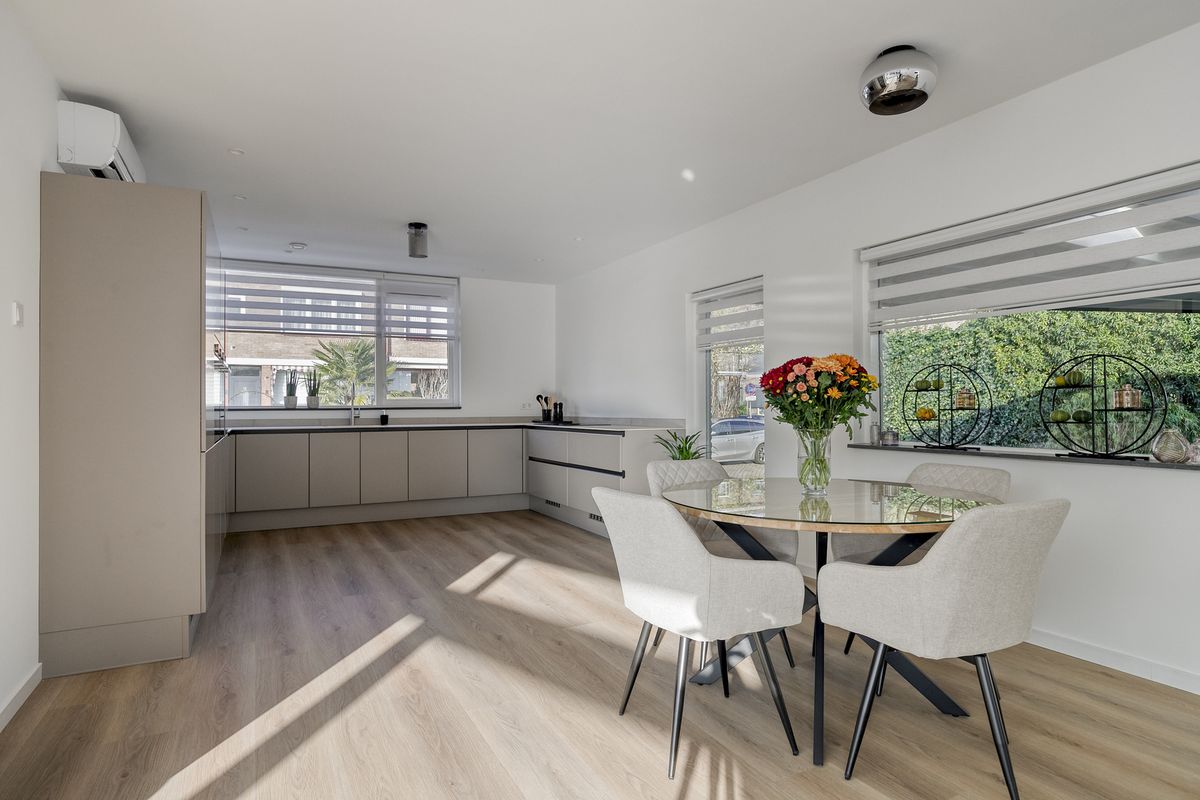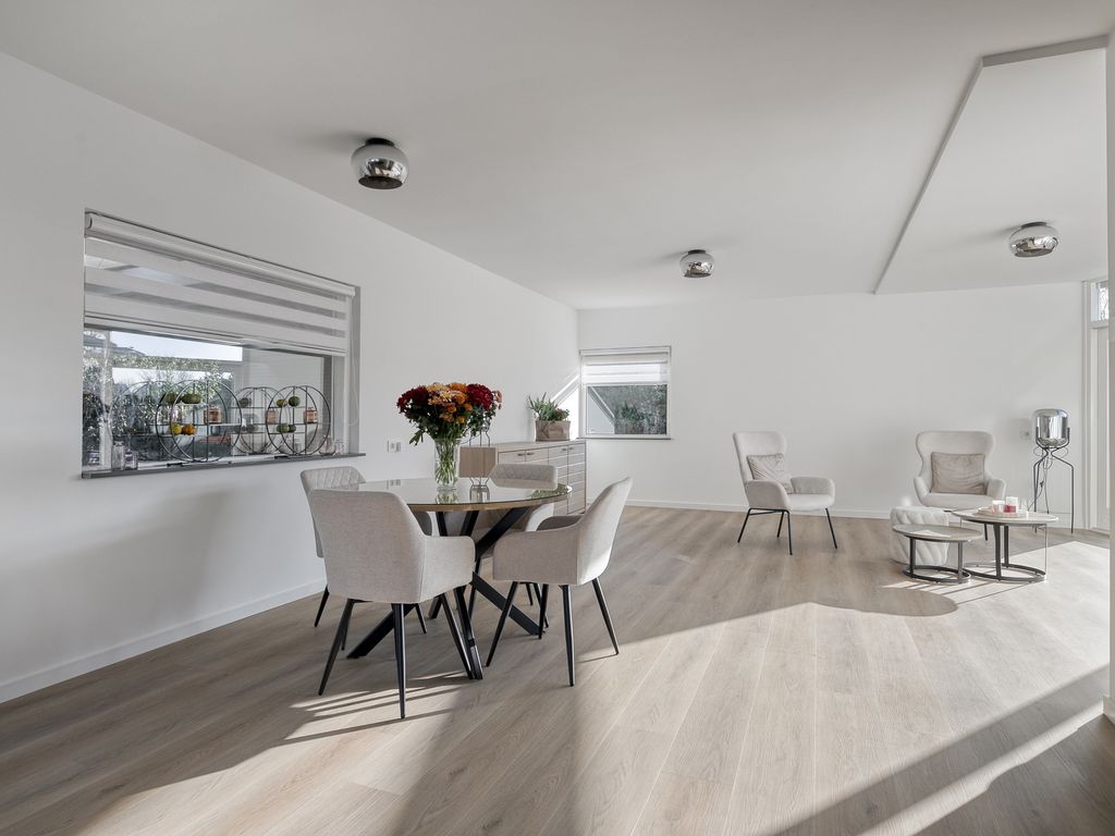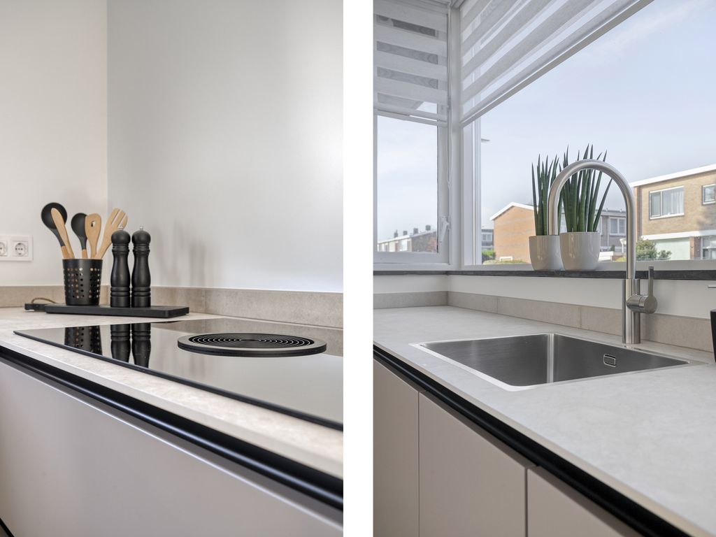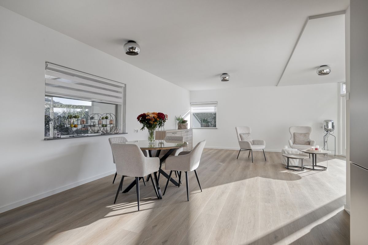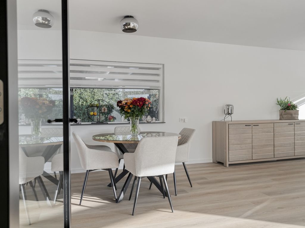 - De open keuken is gesitueerd in een U-vormige opstelling en voorzien van een koelkast, vriezer, Bora kookplaat met afzuiging, warmhoudlade, vaatwasser, combimagnetron, oven en airco.