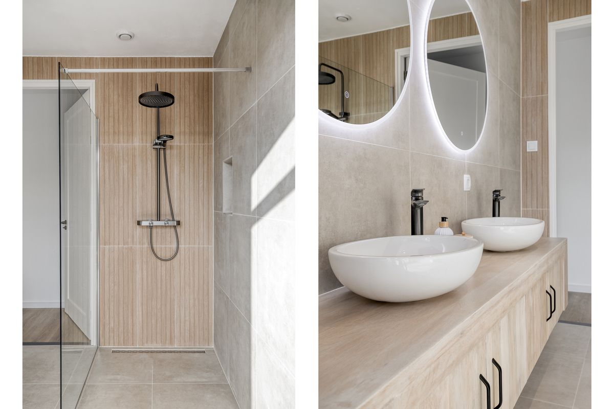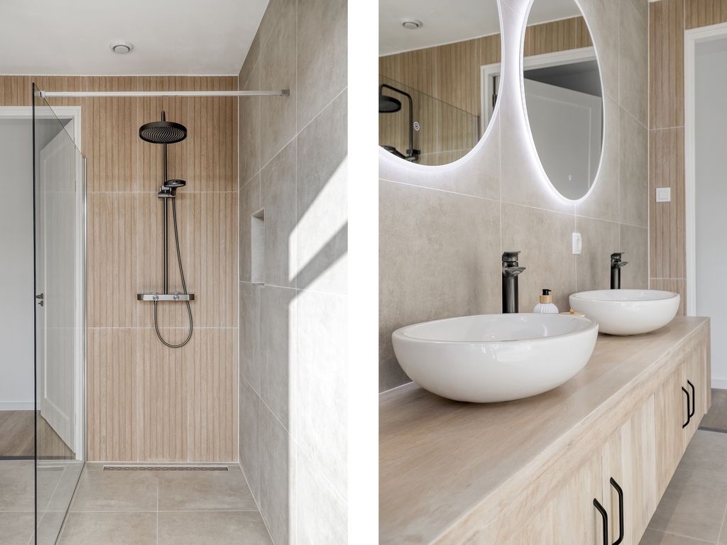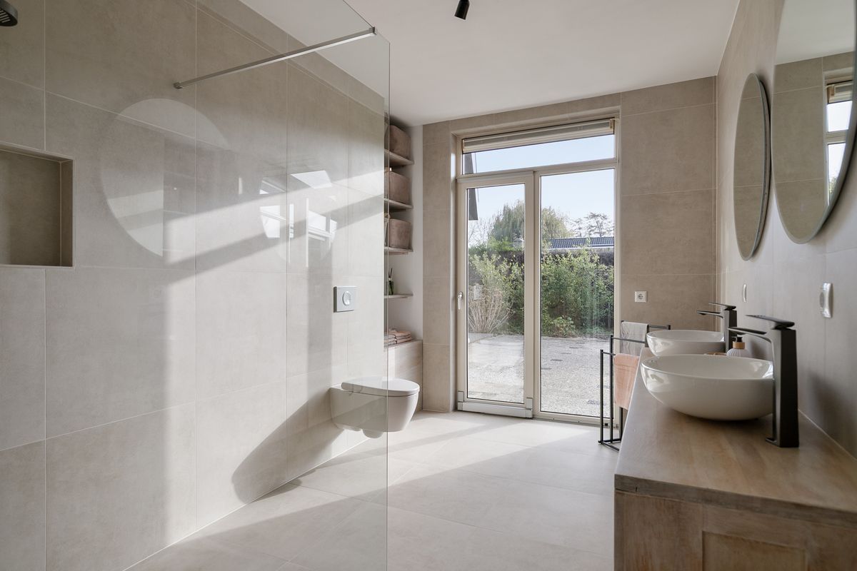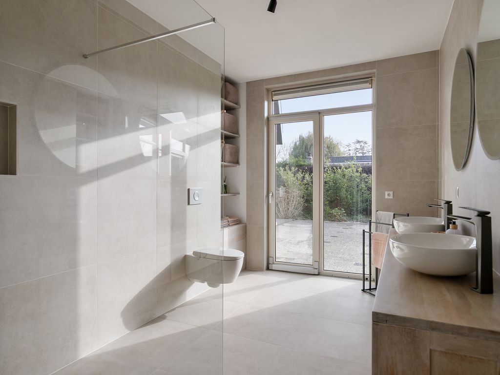 - Badkamer (ca. 3.62 m. x 2.25 m.) voorzien van douche, dubbele wastafel en toilet. Vanuit de badkamer heb je toegang tot de tuin.