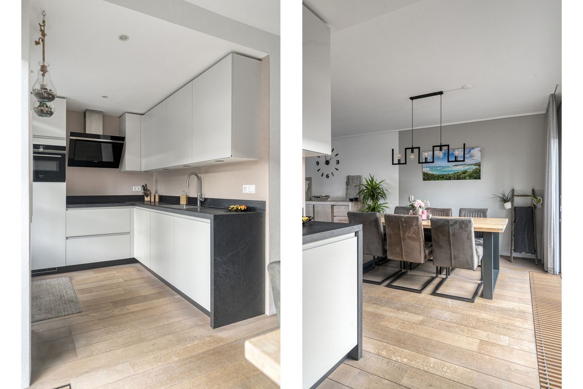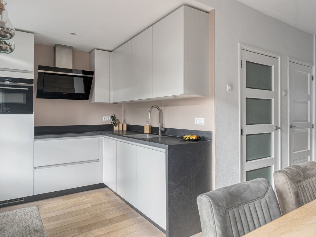 - Open keuken (ca. 2.31 m. x 2.15 m.) gesitueerd in een L-vormige opstelling en voorzien van een koelkast, inductiekookplaat, afzuigkap, vaatwasser, quooker en combi-oven. Vanuit de keuken heb je middels een enkele deur toegang tot de achtertuin.