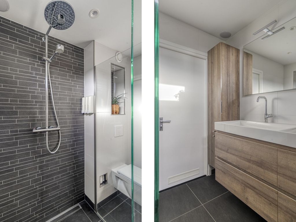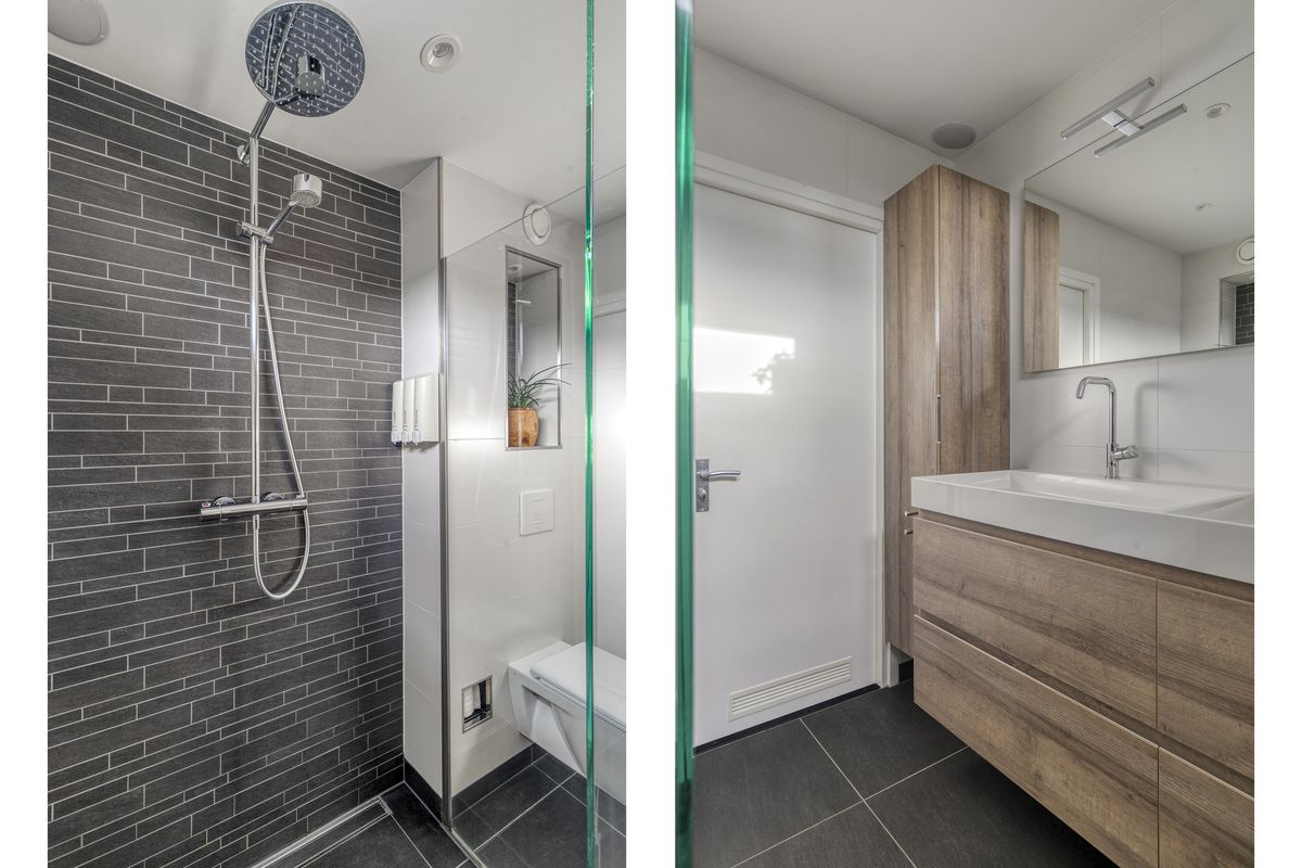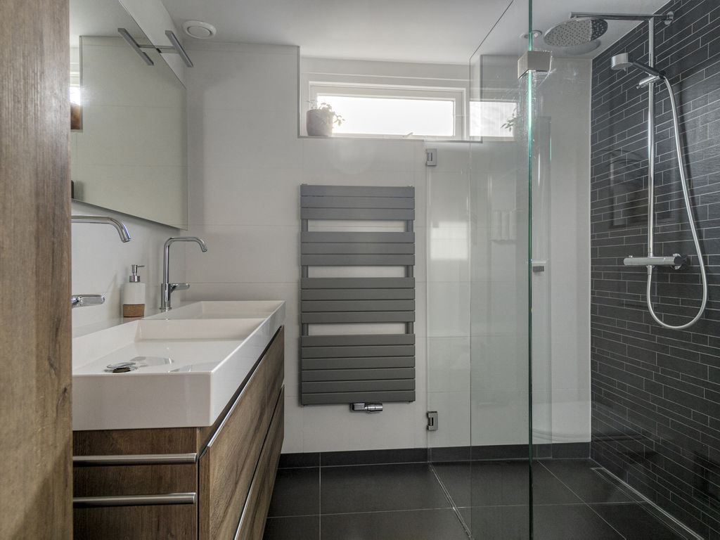 - Badkamer (ca. 2.24 m. x 2.15 m.) gelegen aan de achterzijde van de woning en voorzien van een douche, toilet, dubbele wastafel en vloerverwarming.