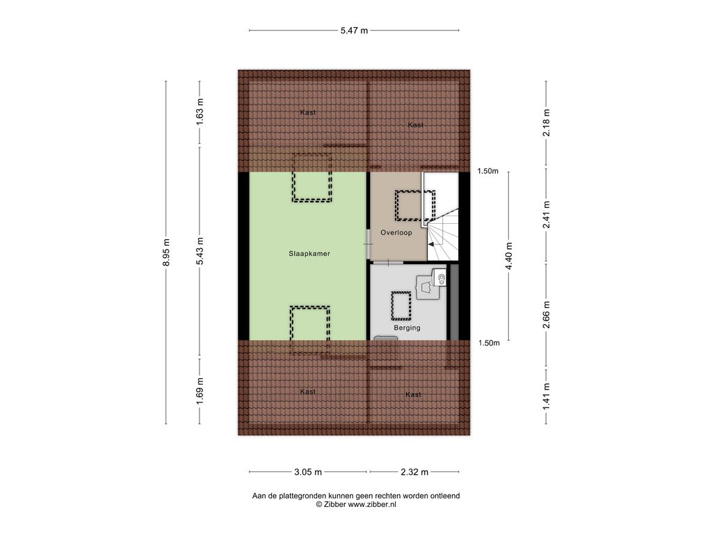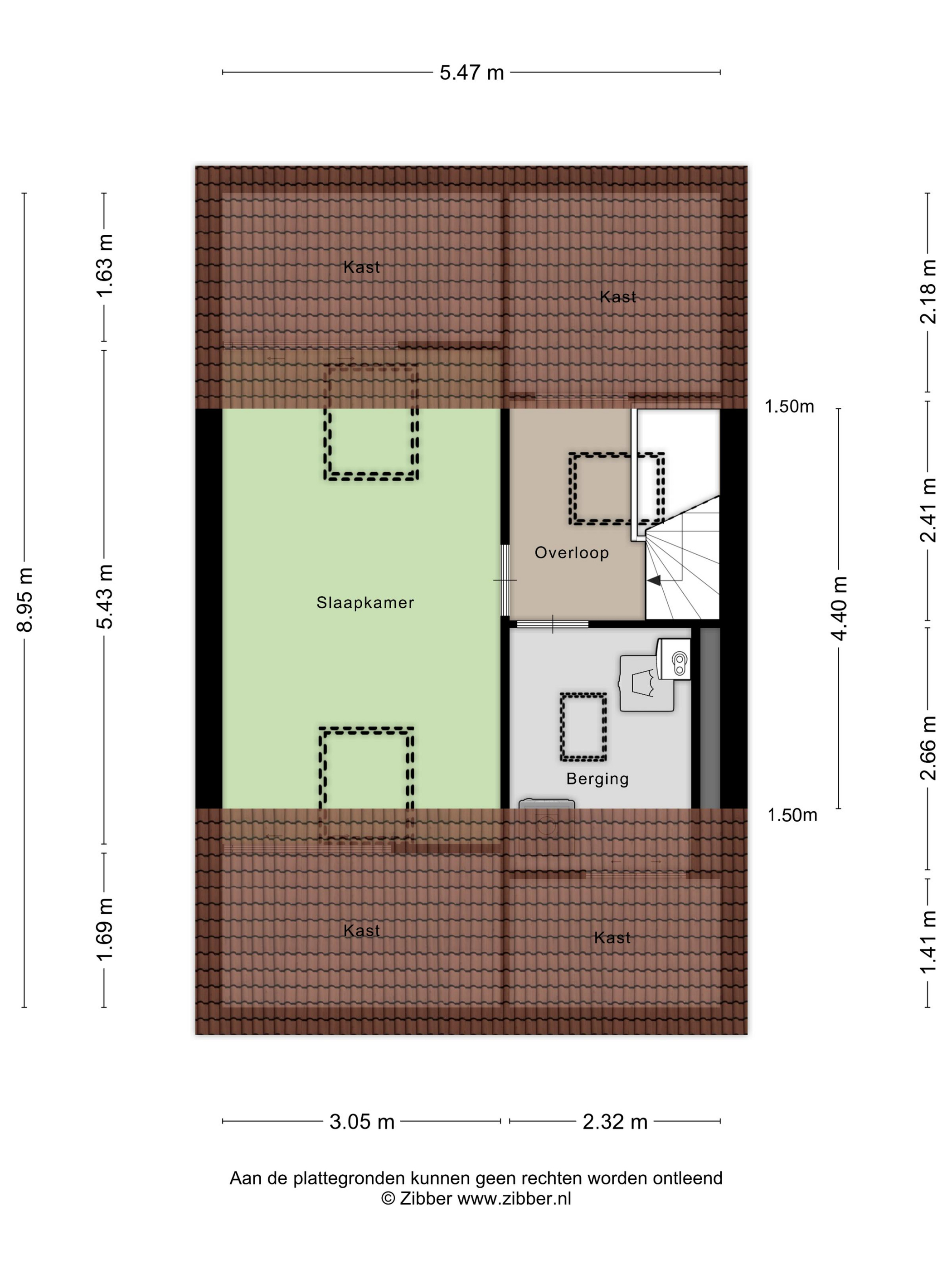 - Slaapkamer IV (ca. 5.43 m. x 3.05 m.) gelegen over de gehele breedte van de woning voorzien van twee dakramen en knieschotten.
