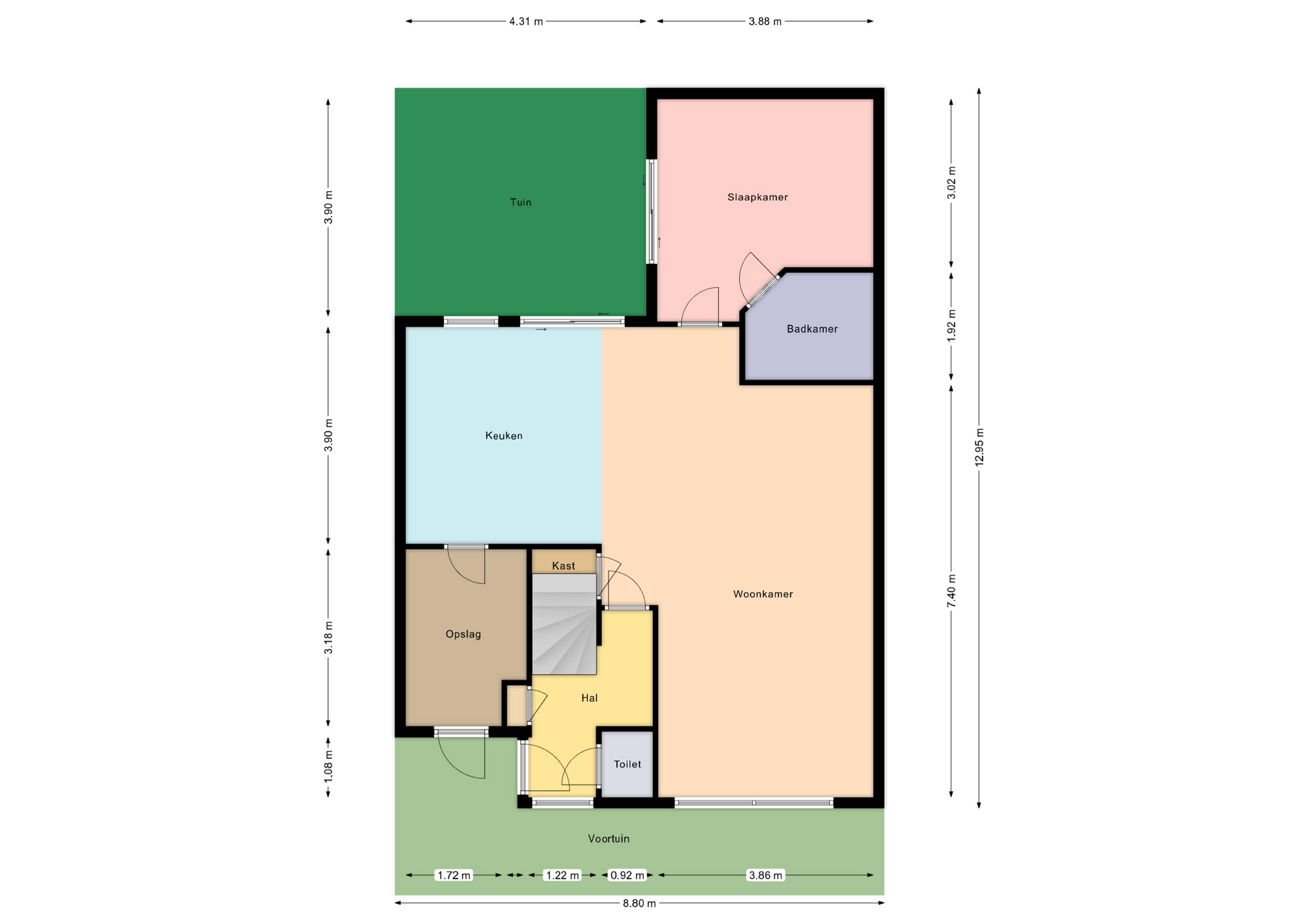 - Toiletruimte (ca. 1.08 m. x 0.92 m.).