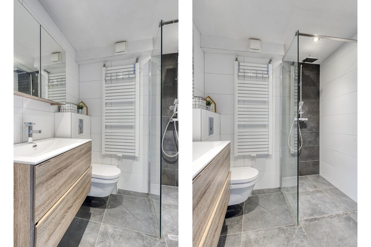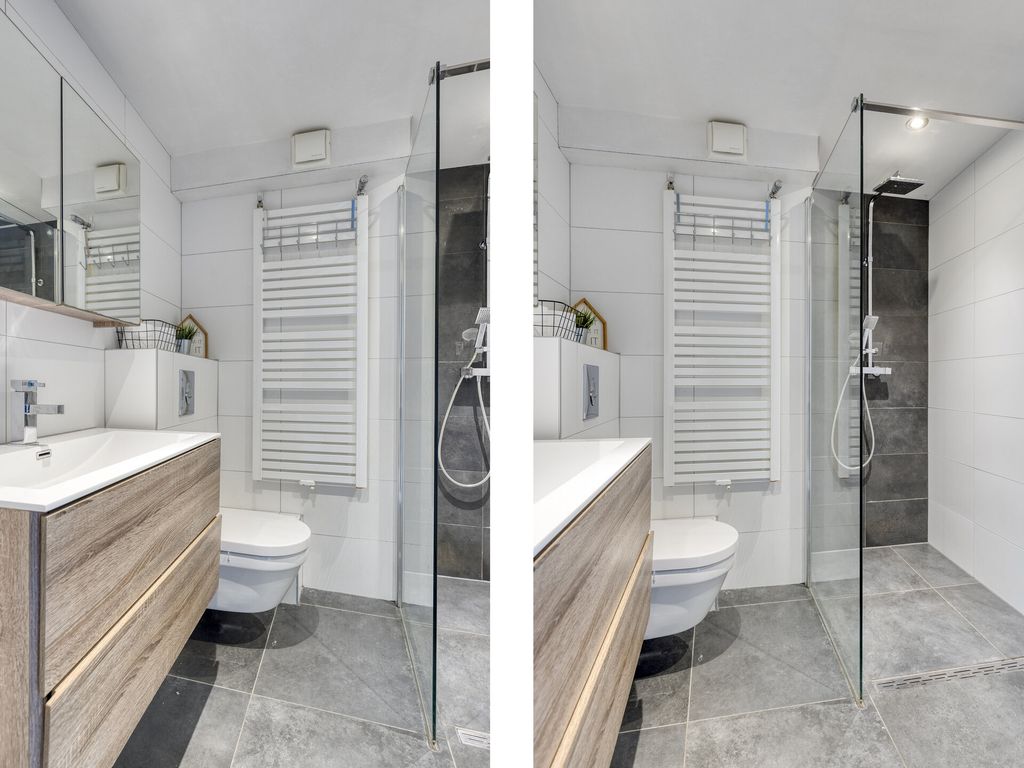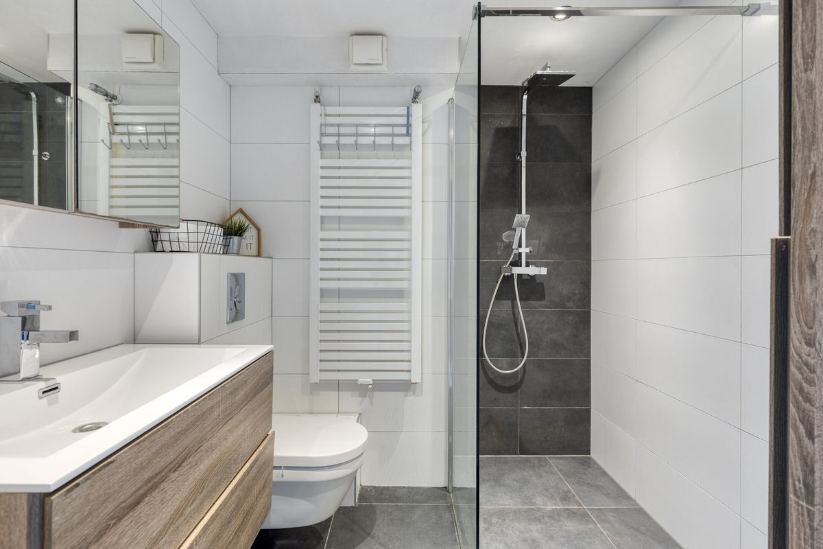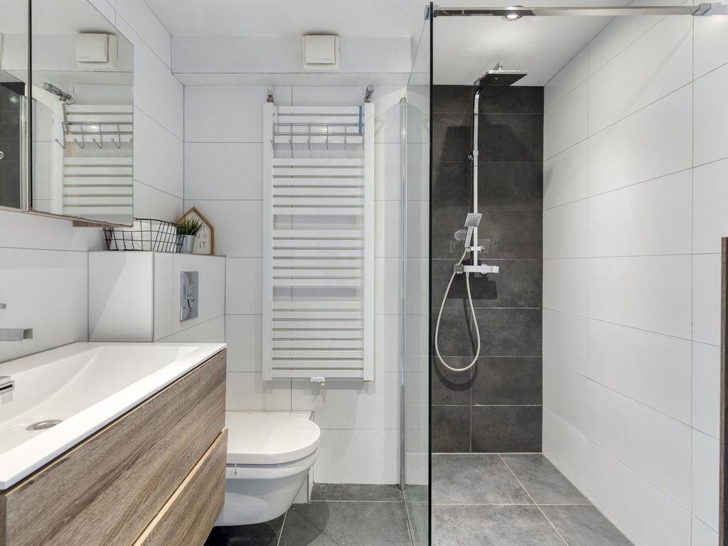 - Badkamer (ca. 2.14 m. x 2.03 m.) gelegen in het midden van de woning en voorzien van een douche, toilet en wastafel met meubel.